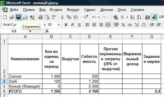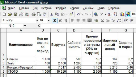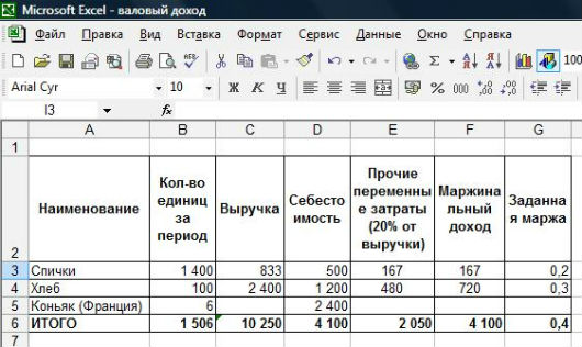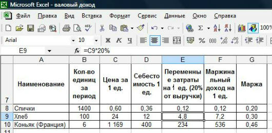 Начнем с того, что найдем общую выручку, которая позволит нам покрыть все затраты, исходя из себестоимости товара и заданной маржи. Составим систему уравнений: Выручка - Себестоимость - Переменные затраты = Маржинальный доход Маржа = Маржинальный доход / Выручка => Маржинальный доход = Выручка * Маржа Примем Выручку за "х", процент переменных затрат - за "а", маржу - за "в". Преобразуем: х - себестоимость - а%х = в%х х -а%х - в%х = себестоимость х (1-а%-в%) = себестоимость х = себестоимость / (1-а%-в%) В нашем случае: х = 4 100 / (1-0,2-0,4) = 10 250 А теперь предположим, что мы не можем продавать спички с маржой более 20%, и хлеб - 30%. По той же схеме считаем выручку на указанные товары.