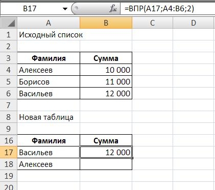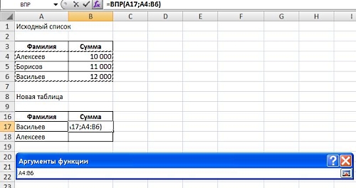 Как мы видим, данные в исходной таблице расположены по алфавиту. Данные же в новой таблице могут располагаться в любом порядке и не обязательно полным списком. Функция ВПР поможет найти сумму по каждому сотруднику и перенесет ее в графу новой таблицы рядом с фамилией. Итак, активизируем нужную ячейку, например, рядом с фамилией «Васильев» и вызываем функцию: