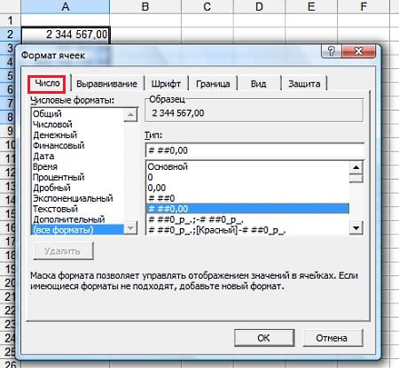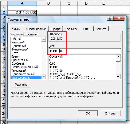Далее в окошке "Тип" ставим курсор после первого нуля перед запятой и делаем пробел. Как видим, число, указанное в образце, преобразилось: