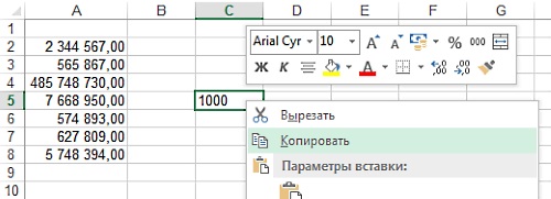 Если же Вам нужно именно разделить значения на 1000, то следует воспользоваться функцией "Специальная вставка". Для этого, в любой ячейке рядом с таблицей пишем 1000, заходим в эту ячейку и копируем ее.