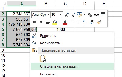 Выделяем весь диапазон с числами, которые нужно разделить на 1000 и вызываем "Специальную вставку", нажав на правую клавишу мыши.
