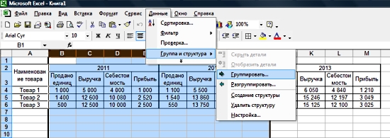 Как правило, такие таблицы содержат много деталей и работать с ними не очень удобно. Скроем информацию, не актуальную на данный момент, с условием, что скрытая информация будет доступна одним нажатием кнопки мыши. Для этого воспольземся группировкой данных. Выделим скрываемую область, найдем в меню "Данные" - "Группа и структура" - "Группировать":