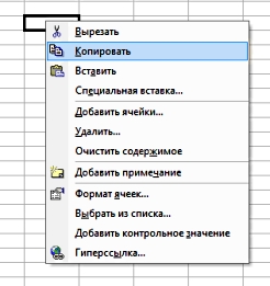 Копирование в ExcelДля того, чтобы скопировать информацию, активизируем нужную ячейку, вызываем правой кнопкой мыши меню и выбираем "Копировать":