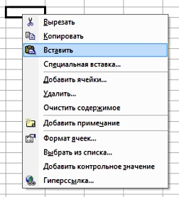 Далее выделяем ячейку, куда хотим вставить скопированную информацию, вызываем правой кнопкой мыши меню и выбираем "Вставить"