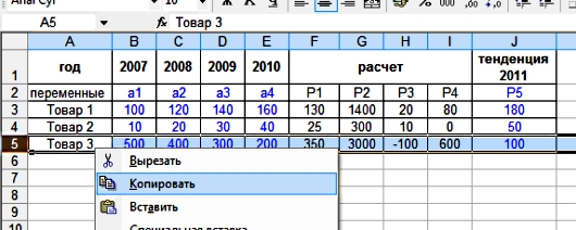 и хотим, чтобы остальные строки таблицы содержали в себе те же формулы. Для того, чтобы скопировать строки с формулами, необходимо: - выделить одну строку, содержащую формулы и, не убирая курсор с выделенной области, вызвать меню правой кнопкой мыши и выбрать "Копировать".