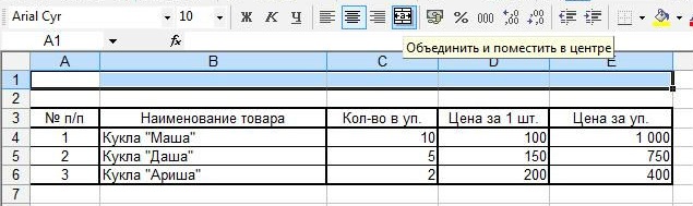 Для этого нам нужно объединить ячейки над таблицей.