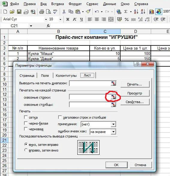 в которое мы добавляем нашу шапку путем нажатия на серое поле рядом с ней. Если все сделали правильно, то в белом поле появляются координаты шапки. Появились? Смело нажимаем на кнопочку и возвращаемся во вкладку "Лист". В поле "сквозные строки" должны появиться координаты нашей шапки.