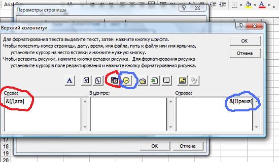 Для того, чтобы установить дату или время печати документа в Excel в верхней или нижней части страницы необходимо использовать колонтитулы. Читайте о том, как установить верхний и нижний колонтитулы. Установим дату и время печати в верхней части страницы. Для этого откроем "Колонтитулы" и выберем Активизируем нужное окошко ("Слева", "В центре" или "Справа") и нажмем на соответствующие кнопочки: для того, чтобы установить дату - на кнопку, обведенную красным цветом, время - на кнопку, обведенную синим цветом: