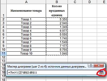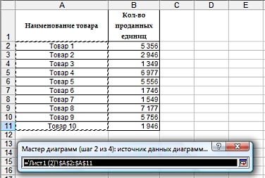 Сюда должна войти информация по количеству проданных единиц товара без шапки и наименований товаров. Для выбора диапазона нажимаем на верхнюю ячейку выделяемого диапазона и протягиваем до нижней. Нажимаем на кнопку, выделенную красным, и возвращаемся в мастер диаграмм: