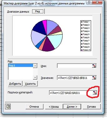 В окошке "Подписи категорий" нажимаем на соответствующую кнопочку (обведена красным) и выделяем наименования товаров: