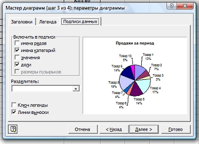 Добавим название таблицы (закладка "Заголовки) и подпишем наименование товаров и доли в общей сумме продаж (закладка "Подписи данных"). Следующим шагом нужно выбрать размещение готовой диаграммы. Ее можно поместить на том же листе, где расположена базовая таблица, либо на отдельном листе во всю страницу: