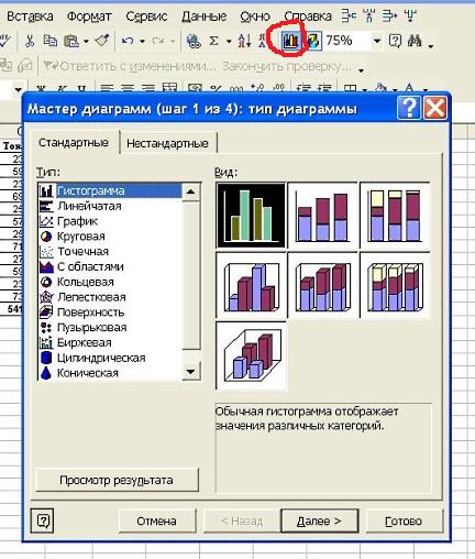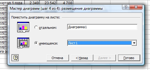 Выбираем способ размещения и нажимаем "Готово". Диаграмма готова! При желании можно менять параметры готовой диаграммы, нажав на таблицу правой клавишей мыши. Например, можно выбрать другой тип диаграммы: