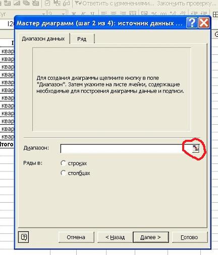 Жмем «Далее» и видим окно, где нужно заполнить диапазон диаграммы и выбрать направление диаграммы (строки или столбцы). Выбираем диапазон диаграммы путем нажатия на кнопку, обведенную красным: