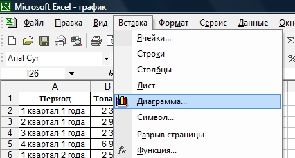За построение графиков и диаграмм в Excel отвечает «Мастер диаграмм», который вызывается через функцию "Вставки"-"Диаграмма" главного меню: