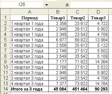 Предположим, что Вы готовитесь к выступлению о результатах деятельности предприятия. Ваша задача – представить материал в наиболее наглядном и показательном виде. Не секрет, что лучше всего с этой задачей можно справиться при помощи графиков и диаграмм. Этим мы и займемся. К примеру, мы имеем дело с отчетом по продажам за 3 года следующего вида:
