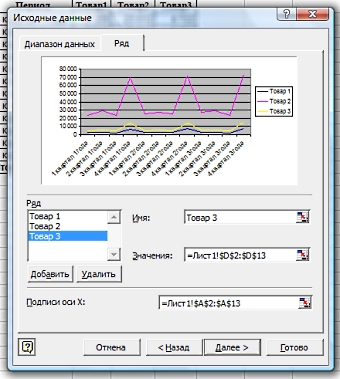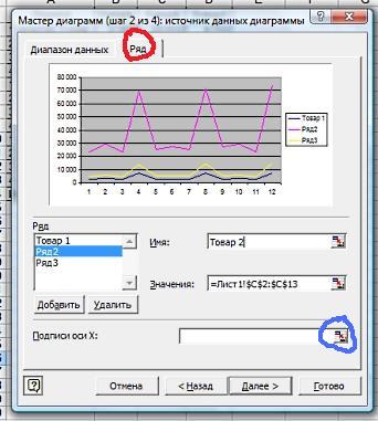 Для того, чтобы подписать оси таблицы и наименование товаров, зайдем в закладку "Ряд".