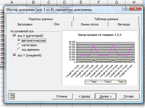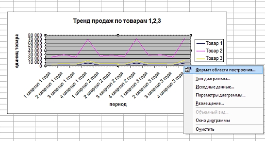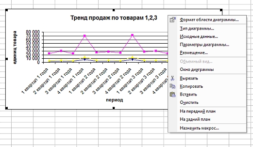 Информация читается довольно сложно. Для презентации лучше преобразовать ее в Построим график и посмотрим тренд продаж по видам товаров. За построение графиков и диаграмм в Excel отвечает «Мастер диаграмм», который вызывается через функцию "Вставки"-"Диаграмма" главного меню: