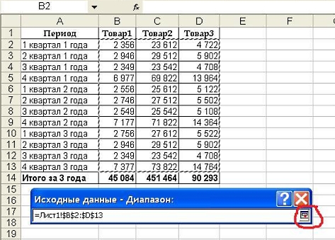 Для выбора диапазона нажимаем на левую верхнюю ячейку выделяемого диапазона и протягиваем до нижней правой ячейки. Нажимаем на кнопку, выделенную красным, и возвращаемся в мастер диаграмм: