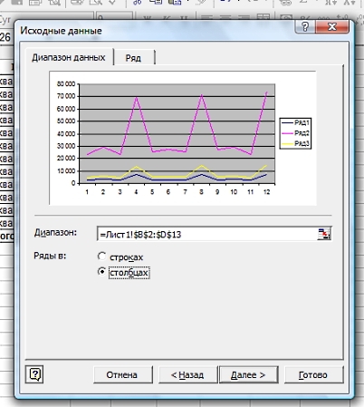 Жмем «Далее» и видим окно, где нужно заполнить диапазон диаграммы и выбрать направление диаграммы (строки или столбцы). Выбираем диапазон диаграммы путем нажатия на кнопку, обведенную красным: