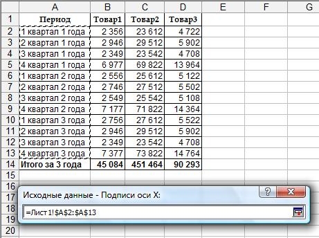 В окошке "Ряд" выбираем ряд, которй собираемся переименовать, в поле "Имя" пишем нужное наименование и проверяем выбранный диапазон в поле "значение" для каждого наименования. Для того, чтобы подписать ось "x", нажимаем на соответствующую кнопочку (обведена синим) и выделяем периоды: