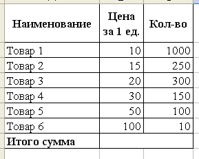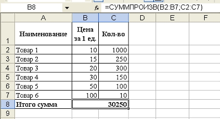 Как перемножить строки или столбцы в ExcelДля того, чтобы посчитать общую сумму по счету, не вычисляя сумму по каждому наименованию, нужно использовать математическую функцию «СУММПРОИЗВ». Возьмем для примера простую таблицу: