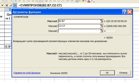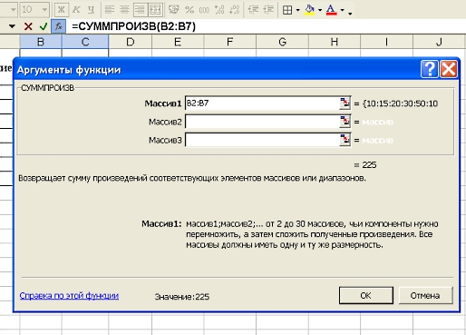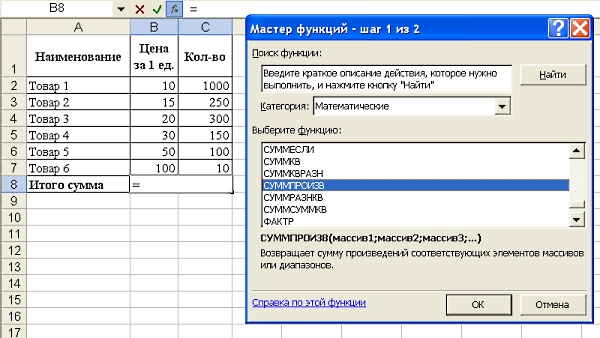 Выбираем в «математических» функциях «СУММПРОИЗВ»: