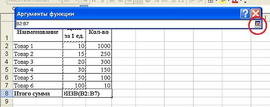 Появляется окошко «Аргументы функции». Для выбора аргументов выделяем нужный диапазон протягиванием мыши от первой до последней ячейки. Возвращаемся в функцию путем нажатия на кнопочку, обведенную красным: