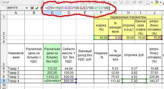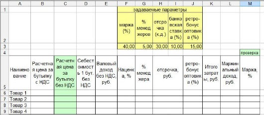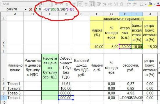 При этом часть показателей неизменна для всех видов товара, поэтому мы их вынесем в отдельный блок "задаваемые параметры", и сделаем так, чтобы при изменении этих параметров менялись расчеты во всей таблице.