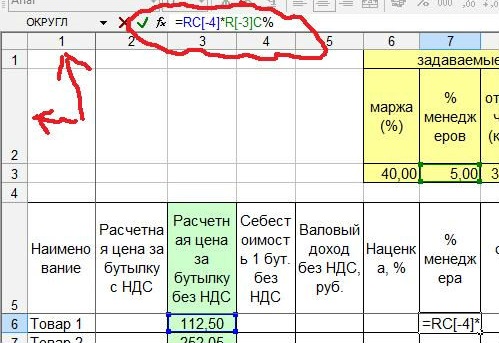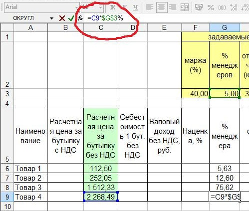 Значения, названные словами, мы рассчитаем с помощью абсолютных ссылок. Таким образом мы будем иметь возможность, рассчитав цену на один товар, скопировать формулу для других.