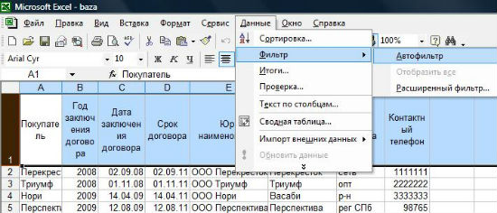 Как же установить автофильтр? Необходимо активизировать шапку, нажатием левой кнопки мыши на серое поле, зайти в "Данные" главного меню и выбрать закладки "Фильтр" -> "Автофильтр":