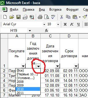 после чего в правом нижнем углу каждой ячейки шапки появится кнопочка. С помощью такой кнопочки можно: 1. Отсортировать подобные значенияНапример в ниже представленном примере мы отсортируем всех клиентов, с которыми были подписаны договоры в 2010 году. Нажмем на кнопочку в нижнем правом углу поля "Год заключения договора" и выберем 2010: