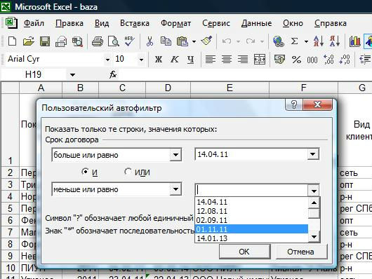 2. Задать условие и отсортировать значения, соответствующие условиямНапример, нам нужно выяснить, с какими клиентами нужно перезаключить договор в 2011 году в связи с окончанием его срока. Для этого мы нажимаем на кнопочку в правом нижнем углу поля "Срок договора" и выбираем "Условие...". Выбираем среди команд "больше или равно" и "меньше или равно", среди значений - соответственно первую и последнюю дату 2011 года.