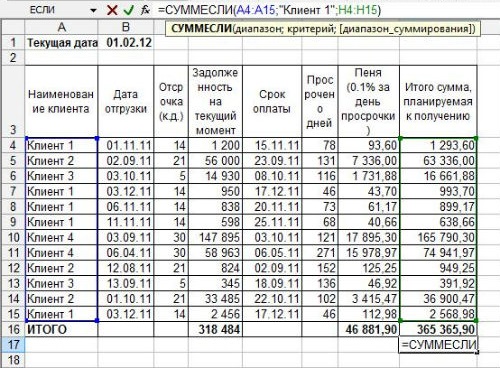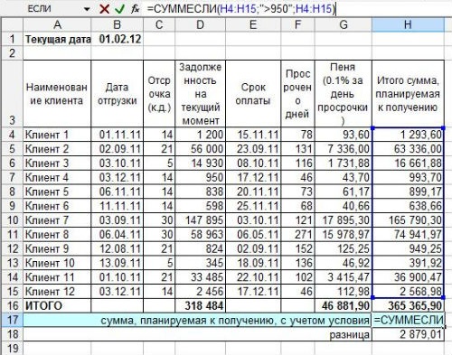 Предположим, что судебные издержки составляют 950 рублей на одного клиента. Для того, чтобы узнать общую сумму, на которую мы можем рассчитывать после положительного решения суда без учета задолженности контрагентов, имеющих задолженность меньше 950 рублей с учетом пени, используем логический оператор «суммесли».