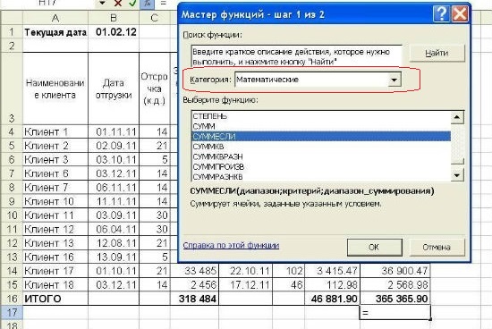 Активизируем ячейку, в которой хотим получить сумму, и находим в функциях (обведено красным) «математические» и выбираем «суммесли».