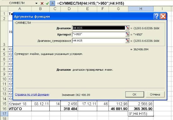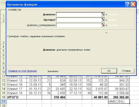 В этом случае в графе «Диапазон» мы проставляем значения первого столбика, а в графе «Критерий» вручную пишем «Клиент 1», либо выбираем любую ячейку, содержащую это значение. В графе «Диапазон_суммирования» выбираем последний столбик, т.к. хотим выбрать задолженность по Клиенту 1 из общей суммы.