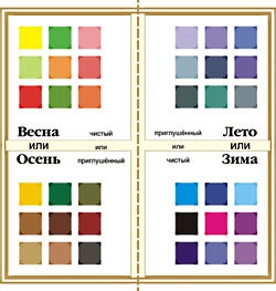 Теперь мы знаем, какие цвета нам больше подойдут теплые или холодные. Шаг второй:Определяем, какие именно цвета, какого времени года подходят вам. Для этого легко использовать цветные платки, отражающие характер каждого времени года в тонах: красного, синего, зеленого, желтого, фиолетового и коричневого цвета. Также достаем все ткани, имеющиеся у нас дома, полотенца, скатерти, всё, что может нам пригодиться. Лучше всего заниматься этим в светлой, спокойной комнате при ярком дневном освещении перед большим зеркалом, в котором мы можем видеть себя по пояс или во весь рост. Снимаем с себя украшения. Лицо в этот момент должно быть без косметики. Прикладываем ткани таким образом, чтобы видеть свой образ с этим цветом. И смотрим, какие именно оттенки делают Вас более выразительными, подчеркивают красоту Ваших глаз, цвета кожи и волос. Смотрим на себя с любовью и выбираем себе только самое лучшее, те холодные или теплые нюансы красок, которые подходят именно Вам. Вот основные цвета по цветотипам: ЗимаЧёрный, белый ослепительный, с голубизной. Броские - яркие цвета - алый, малиновый, ультрамарин, лавандовый, цвет фуксии, васильковый. Сочетания цветов контрастные по светлоте и тону - белый с чёрным, ультрамарин с лимонным, чёрный с красным. Зиме идёт серебро, серебристые оттенки серого, зелёного, синего. Прекрасно выглядят оттенки, близкие к чёрному - чёрно-зелёный, чёрно-фиолетовый, черно-синий, чёрно-коричневый. ВеснаКарамельные тона, тёплые пастели, светлые оранжевые, коралловые и томатные оттенки красного, кремовые и золотистые бежевые, светло-коричневые, чистые золотисто-жёлтые, жёлто-зелёные, оливковые, светлые красновато-фиолетовые, цвет верблюжьей шерсти, цвет яичной скорлупы, слоновой кости, ванили. ЛетоСиреневые, серые, приглушённые светлые голубые и синие тона. Зелёные - ивовый, серо-зелёный цвет полыни или обратной стороны листа мать-и-мачехи, голубовато-зелёный, сине-зелёный. Красные - светлые малиновые и винные оттенки. Серо-жёлтые и неяркие лимонные оттенки. Белые с сероватым оттенком, цвет натуральной шерсти. ОсеньРыжие, ржавые, золотистые, медные, коричневые. Хороши цвета пряностей: карри, корицы, горчицы. Жёлтый - кукурузный, латунный. Красный - гранатовый, коричневато-красный, бордовый. Зелёные блёклые и сложные - болотный, хаки, цвет мха, оливковый, коричневатый, приглушённая бирюза, цвет морской волны (ближе к зелёному, чем к синему).